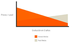 El posicionamiento del site web es crucial para el éxito de la estrategia de presencia de la empresa en internet. Se distinguen 2 tipos de posicionamiento, el natural, es decir la aparición de nuestro site en los resultados de búsqueda (SERP), y por otro lado el de pago, es decir publicidad en internet, en particular anuncios en las páginas de resultados de los buscadores. En el primer caso se hace uso de la técnica SEO, Search Engine Optimization, para conseguir las mejores posiciones en las SERP. Es una estrategia a largo plazo. En el segundo, en especial el SEM, es el Search Engine Marketing, se remunera al buscador para publicar nuestros anuncios y supuestamente atreamos tráfico calificado a nuestra web. Para saber más sobre estos dos tipos de optimización de posicionamiento, leer aquí. Las razones de elegir el uno o el otro método estriban de la evolución del coste de cada uno, veáse el gráfico siguiente: